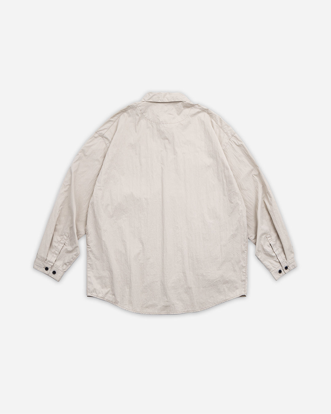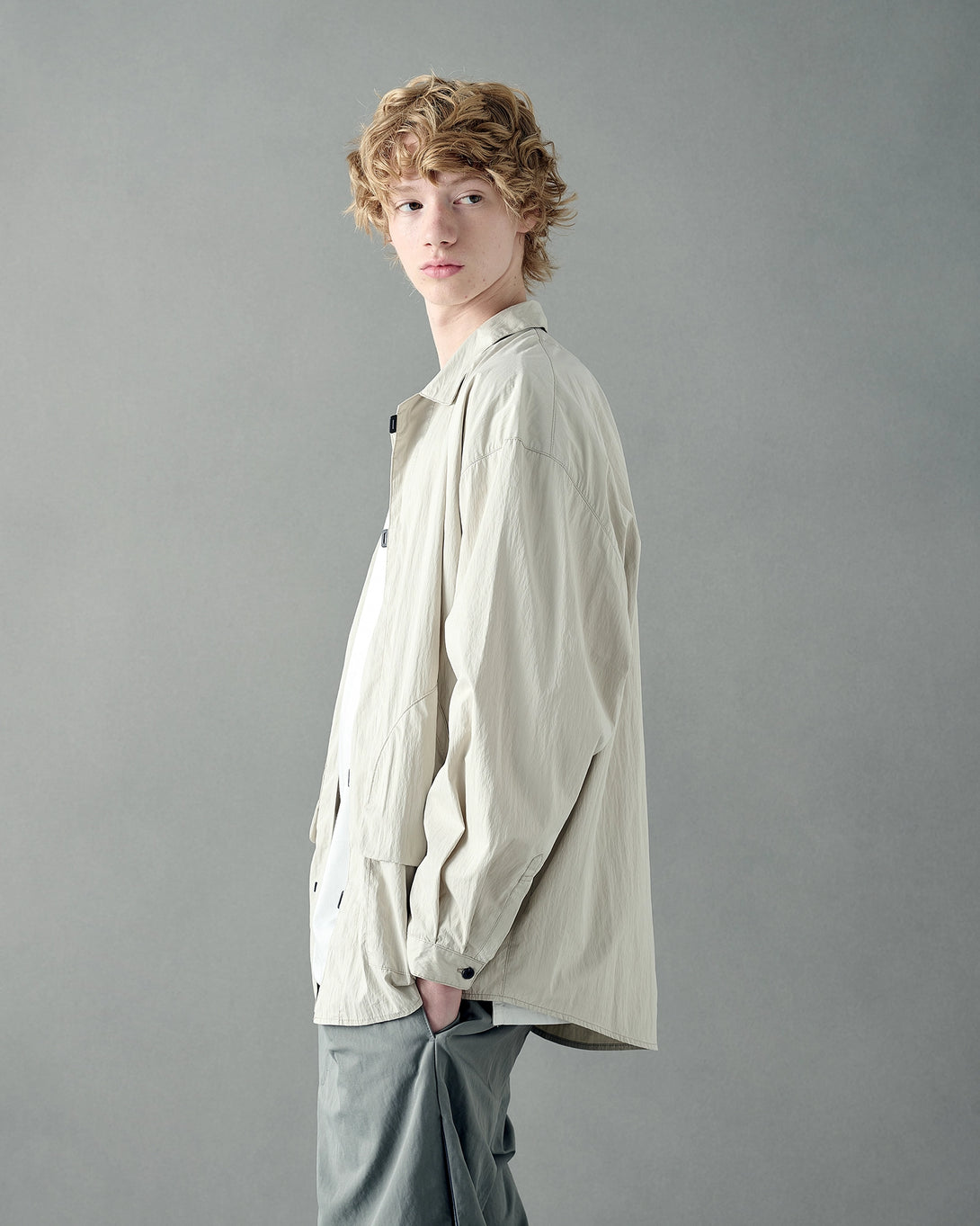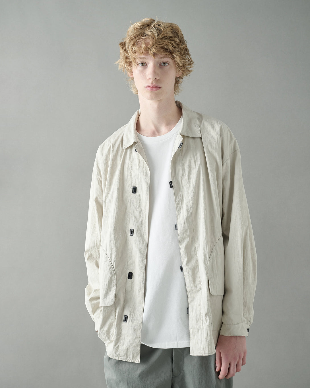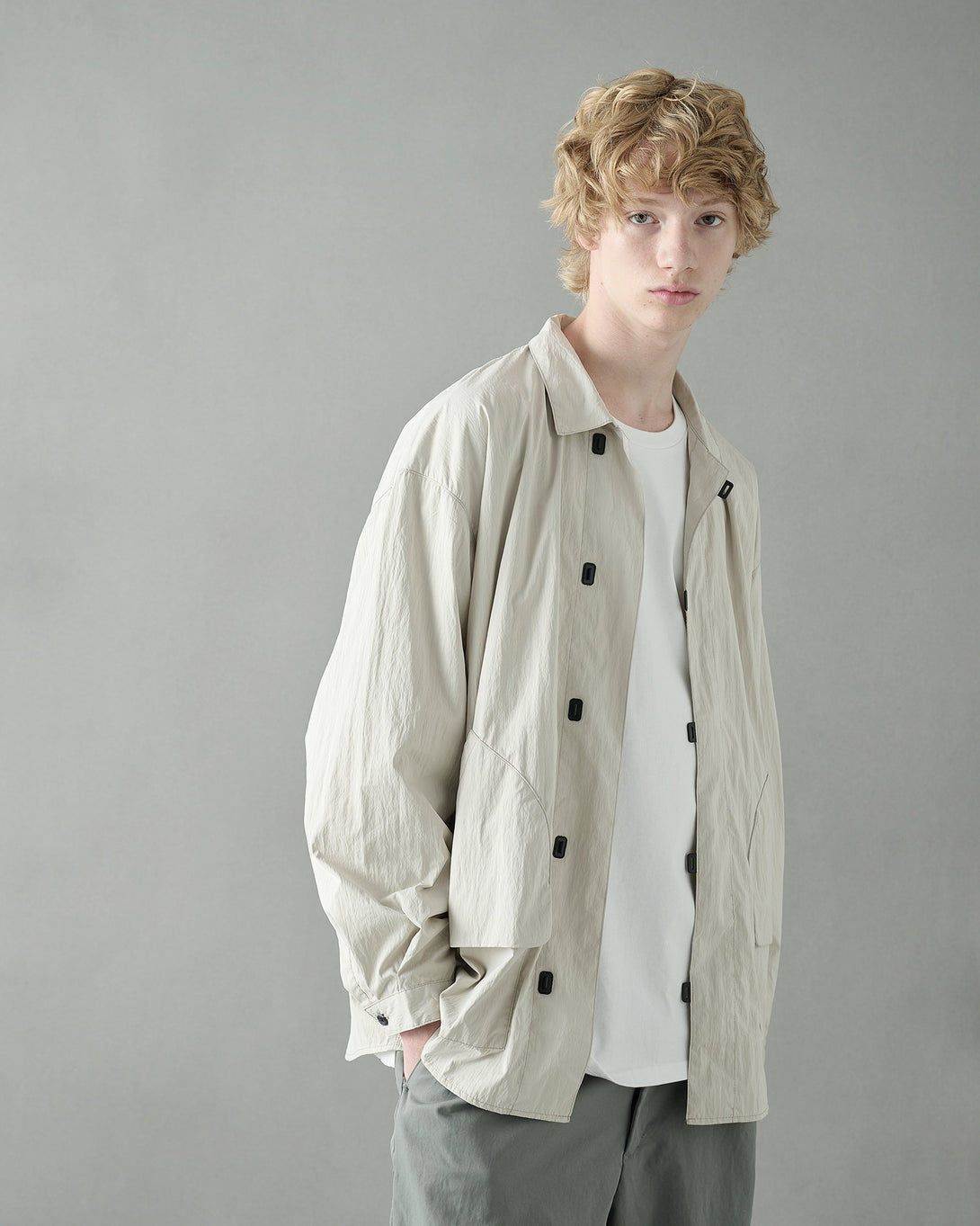 T/C素材のハイブリッドオーバーシャツ。程よいハリ感と柔らかさを兼ね備えた素材で、春先や秋口の軽アウターとして最適です。特殊なスナップボタンを採用しており、開閉がスムーズでスタイリングのアクセントにもなる一着です。