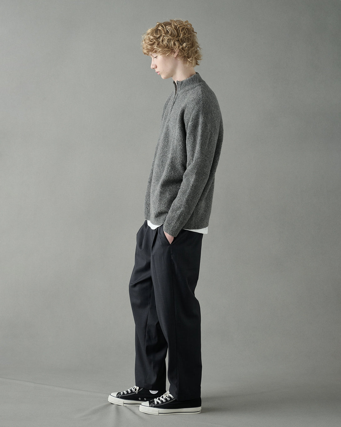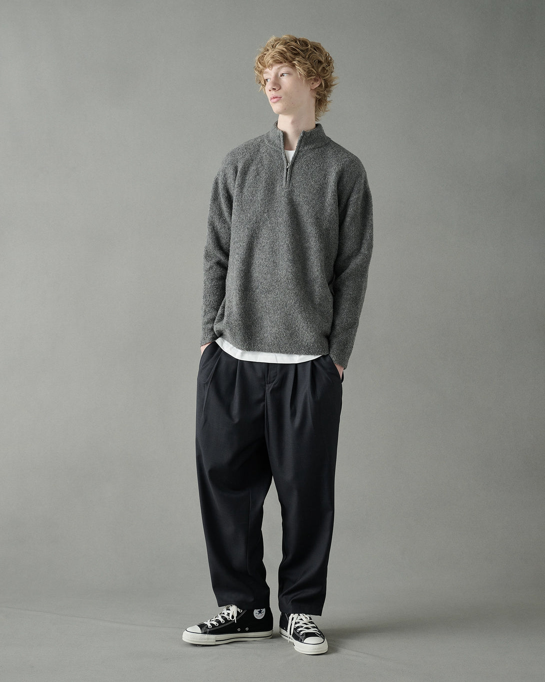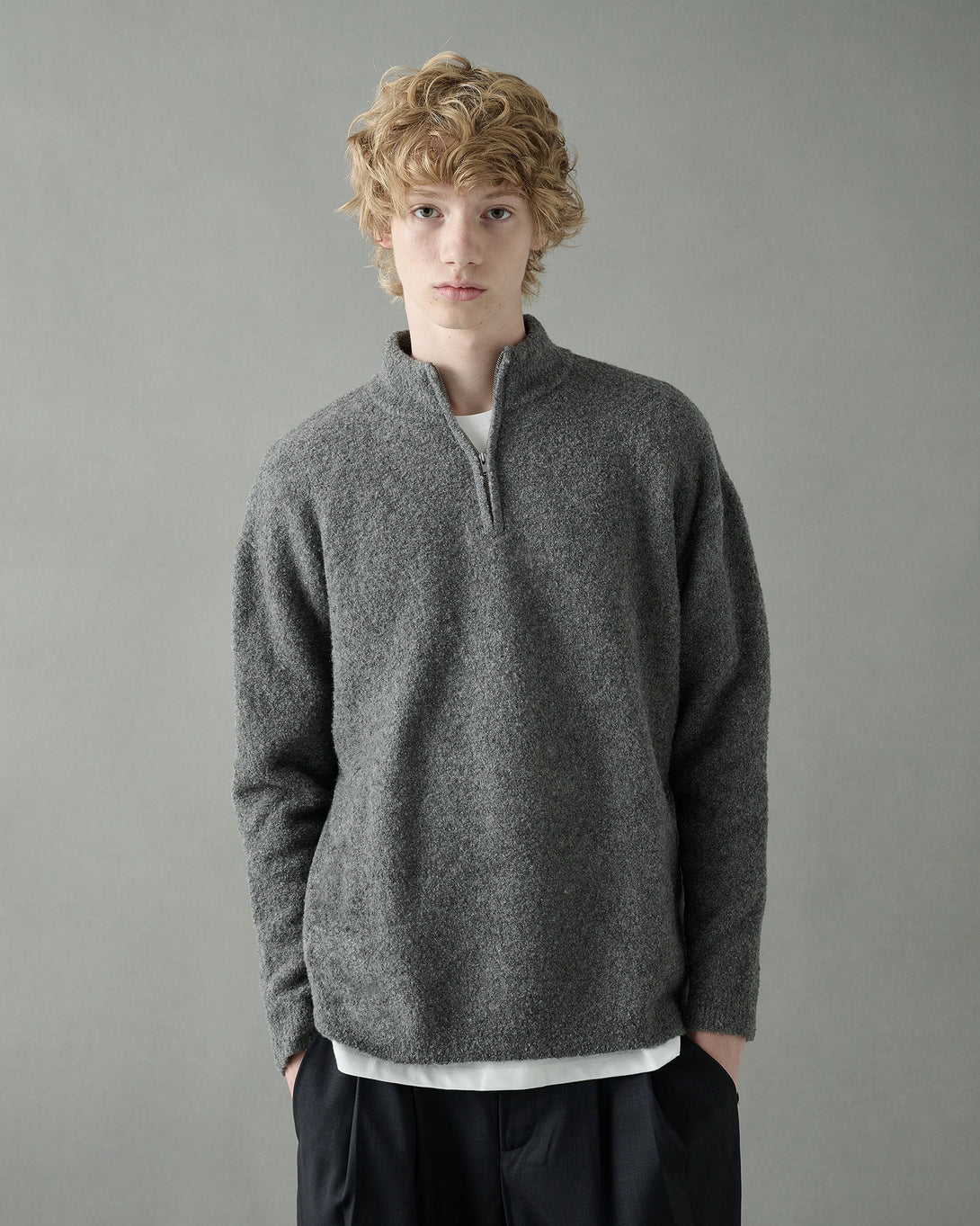 上質なウール素材を使用したハーフジップニット。スタンドカラーにジップを施すことで、着脱や首元の表情を自在に変えられます。シンプルながらも素材感とディテールで大人っぽく仕上げた一枚です。