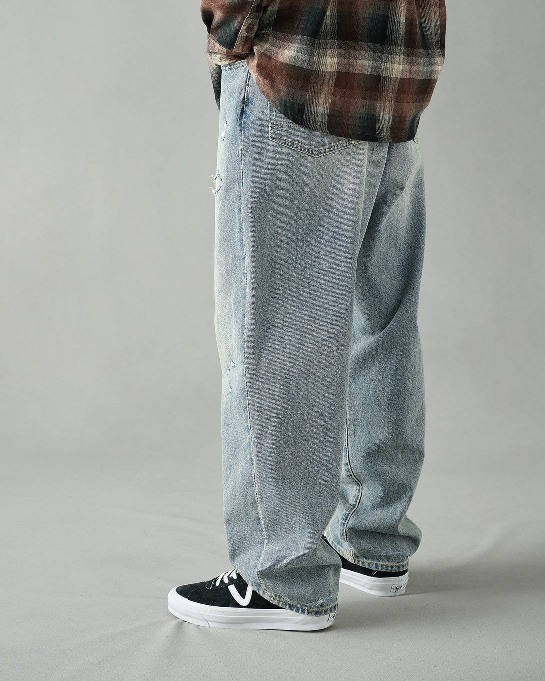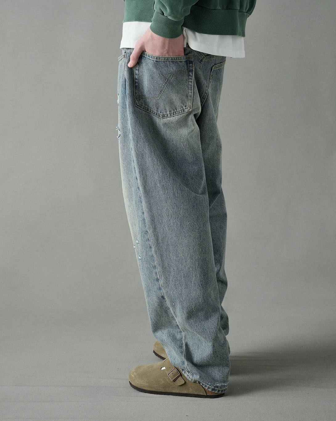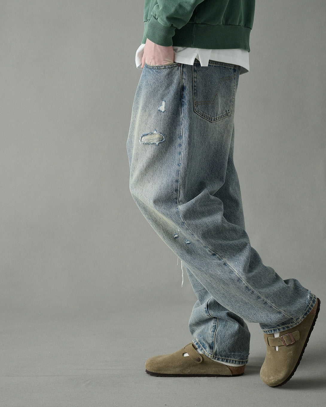 程よいダメージ加工を施したテーパードシルエットのデニムパンツ。