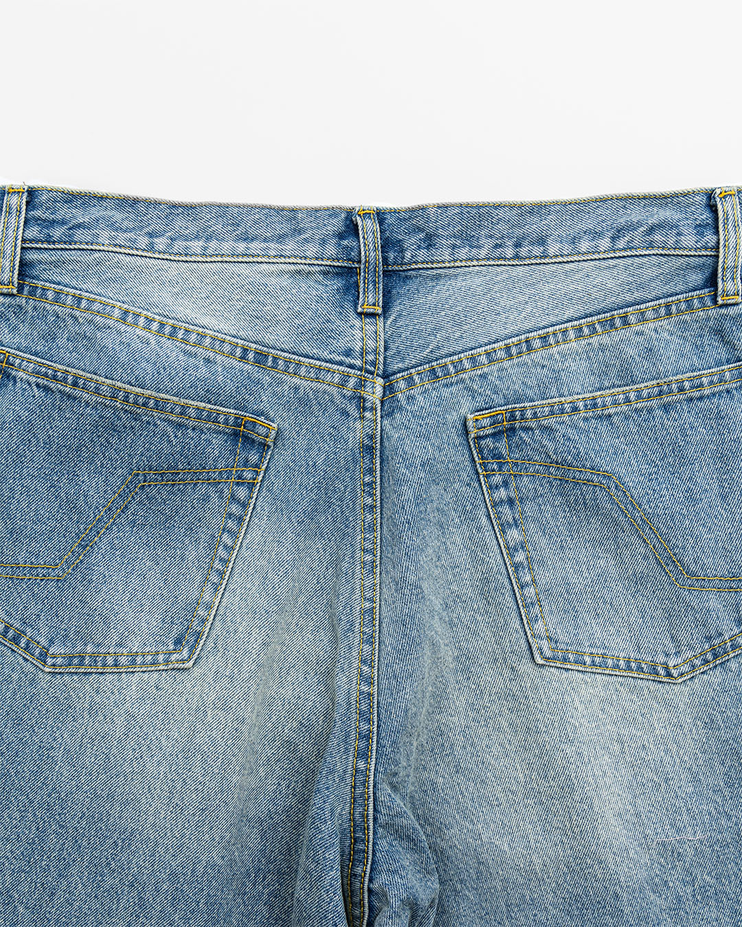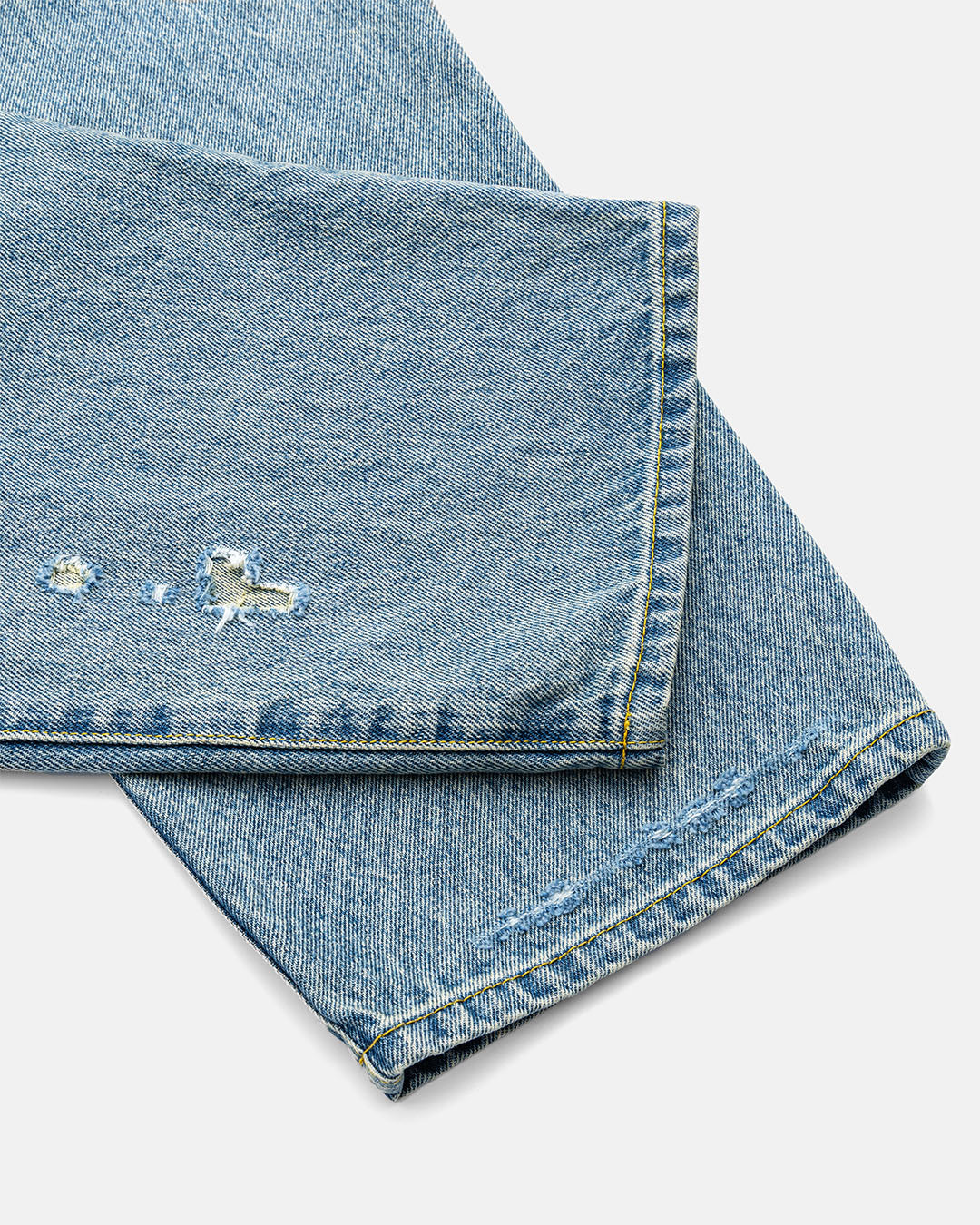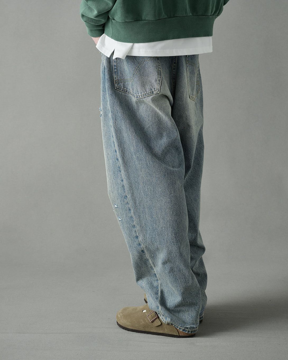 程よいダメージ加工を施したテーパードシルエットのデニムパンツ。